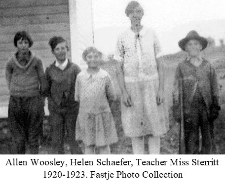 1924-1925: Miss Davis, teacher. School fenced part way yet open to the county road to keep the cattle out of the school yard. Poles along the top of the fence challenged kids to “walk the poles” during recess and lunch time.