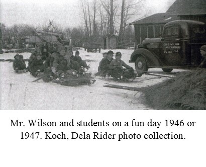 1946-1947: Mr. Chris Wilson taught upper grades. He and his family lived in the teacherage. Marvin Miller remembers acting up in school and Mr. Wilson turning him over his desk and paddling him. He can’t recall why he got paddled but knew he deserved it and that he didn’t do whatever it was again!