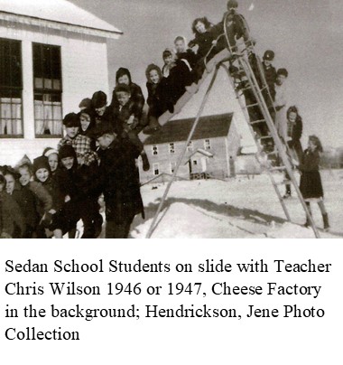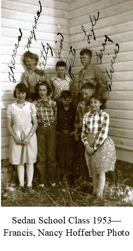 Anita McNamer writes “One of my fond remembrances of the Sedan School was the Christmas Play the winter of 1948, as near as I can recollect. The play was held in the old Cheese Factory. I was the mother in the play and Damion Inabnit was the father and Billy Palmer was the son. The first rehearsal was a riot! At the start of the play, I was “mixing” up a Christmas cake and the son wanted to lick the dish. By the time I rolled off the list of things “Billy” had already eaten so far that morning, the rest of the students and the cast were practically rolling in the aisles. I still get a good chuckle out of that particular memory of my days as a student of Sedan School!”