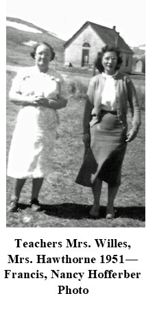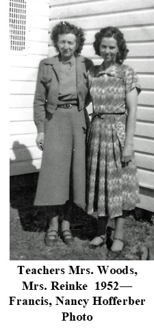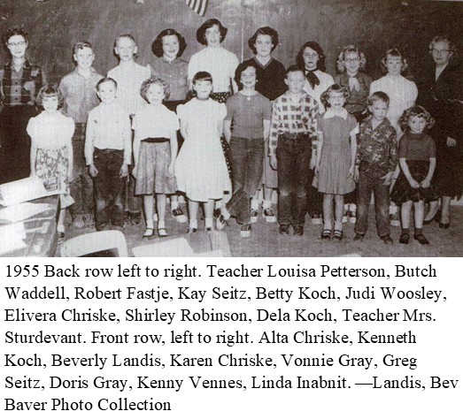 Eva Lachenmaier taught primary grades, 15 students: Lyle Woosley, Terry and Pat Gray, Nancy and Jimmy Francis, Norman, Neil, Larry, and Marcella Spring, Eleanor McNamer, Ella Mae Kurtz, Margery Waddell, Myrna Fastje, and her children Sonja and Ralph Lachenmaier